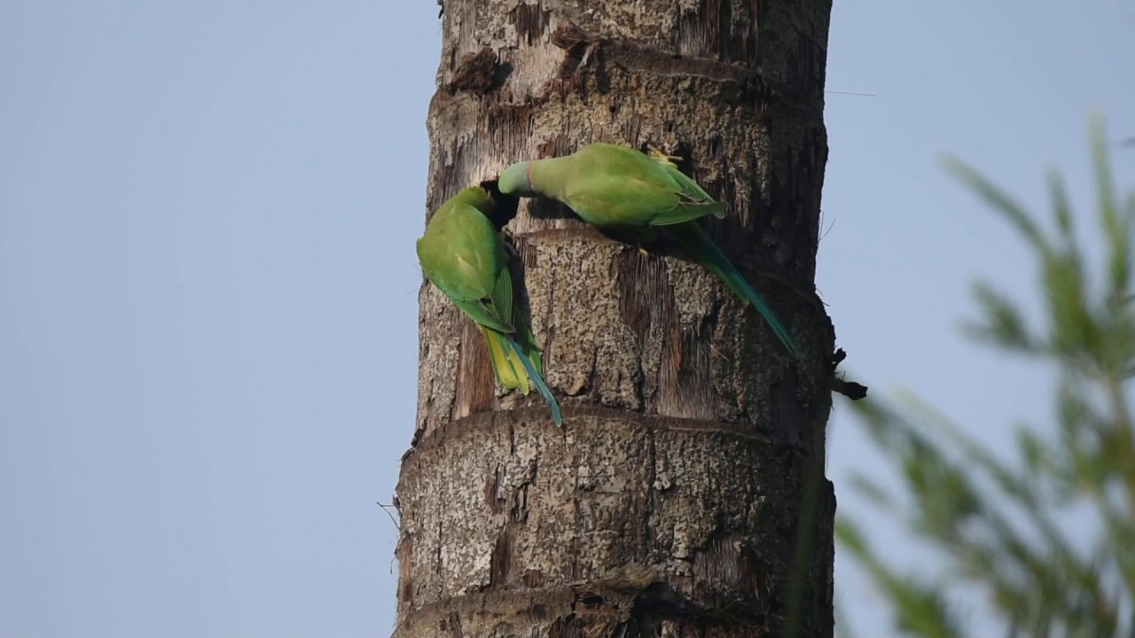 A pair of Rose-ringed Parakeets inspecting a probable nest site. Part 1